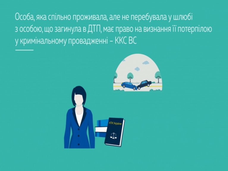 Суди попередніх інстанцій визнали водія винуватим і засудили його за ч. 2 ст. 286 КК України за те, що він, керуючи автомобілем, виїхав на зустрічну смугу руху, де допустив зіткнення з автомобілем, який рухався у зустрічному для нього напрямку. Внаслідок ДТП пасажир автомобіля, яким керував обвинувачений, отримав тілесні ушкодження, від яких помер. На етапі досудового розслідування слідчий залучив у статусі потерпілої особу, яка спільно проживала, але не перебувала у шлюбі з потерпілим. У касаційних скаргах сторона захисту та представник інших потерпілих стверджували, що в розумінні п. 1 ч. 1 ст. 3, ч. 6 ст. 55 КПК України належним підґрунтям для визнання потерпілою в кримінальному провадженні особи, яка спільно проживала, але не перебувала у шлюбі з особою, якій внаслідок кримінального правопорушення заподіяно смерть, є рішення цивільного суду у справі про встановлення відповідного факту проживання однією сім’єю без шлюбу, без якого такі обставини не можуть бути встановлені в кримінальному провадженні.